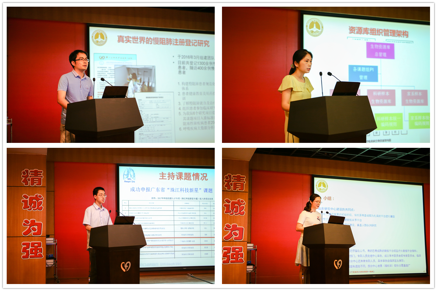 随后,中心主要工作人员作各负责模块的工作报告。其中简文华医师汇报开展的临床信息资源库,呼吸慢病管理数据平台建设情况,以单病种慢性阻塞性肺疾病为切入点,建立起临床随访团队,率先启动呼吸慢病管理平台,建立示范模板及数据自动采集分析处理生态圈,以点带面铺展网络,也为后续更多的病种开展慢病信息管理提供借鉴。目前规范的临床随访包括病史、各自量表、肺功能及相关检查、药物使用等等,人手欠缺。罗文婷汇报生物资源库建设情况,截止目前,14个课题组的生物资源库近68万的样本量,但利用率仍需提高、资源共享力度加大,目前待整合的情况仍需各方支持。关伟杰汇报临床研究组织和取得的成果。张冬莹则汇报全国临床研究中心的建设发展情况,分析其他典型临床研究中心的组织架构和发展规模,以及建设特点,对比差距。