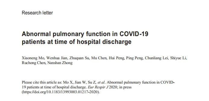 2020-05-25近日,国家呼吸系统疾病临床医学研究中心/广州医科大学附属第一医院/广州呼吸健康研究院钟南山、李时悦团队与广州市第八人民医院雷春亮团队联合报道了新冠肺炎康复期患者出院时的肺功能特征,发现部分患者存在不同程度肺功能损害,主要表现在肺弥散功能障碍...